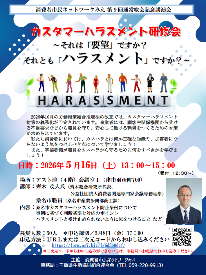 消費者市民ネットワークみえでは、第9回通常総会開催の記念講演として、齊木総合研究所代表 公益社団法人消費者関連専門家会議専務理事の齊木 茂人氏をお招きして、「カスタマーハラスメント研修会 ~それは「要望」ですか? それとも「ハラスメント」ですか?~」をテーマにご講演いただきます。