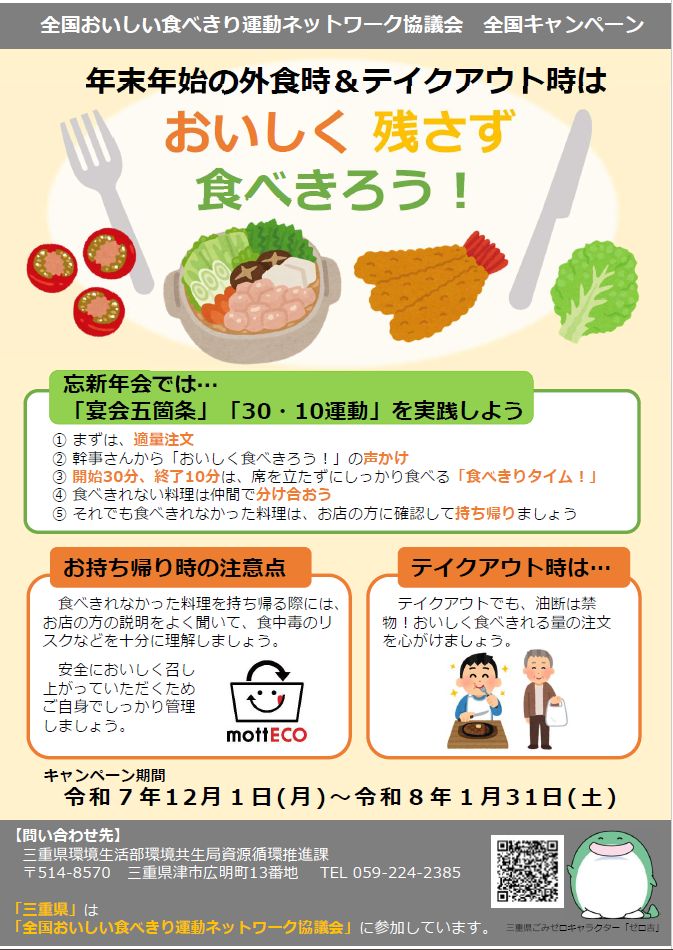 三重県では、食品ロスを減らすため、毎年12月から翌年1月において、外食産業の中でも食べ残し量の割合が高い食事会時の食べきりを呼びかけるとともに、県内の飲食店等に食品ロス削減の啓発活動にご協力いただくキャンペーンを実施しています。