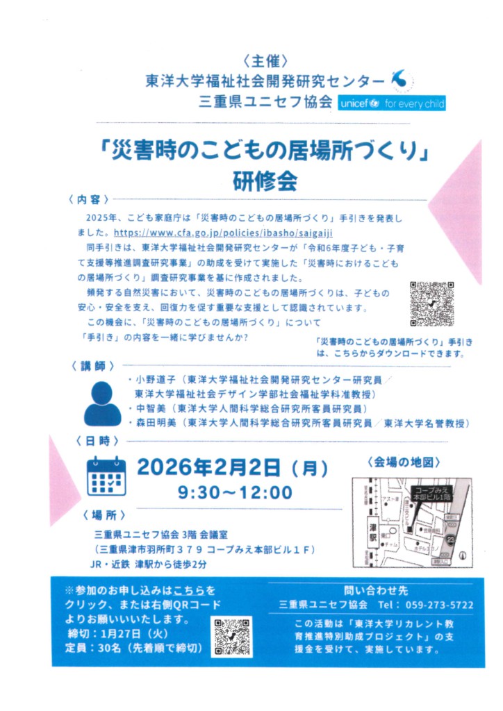 主催 東洋大学福祉社会開発研究センター、三重県ユニセフ協会