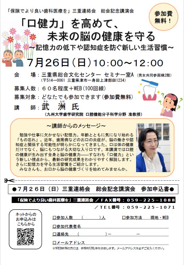 7月26日(日)に三重県総合文化センターにて、「保険でより良い歯科医療を」三重連絡会の総会記念講演会「「口健力」を高めて、未来の脳の健康を守る~記憶力の低下や認知症を防ぐ新しい生活習慣~」が開催されることとなりました。